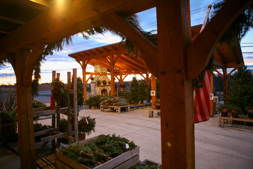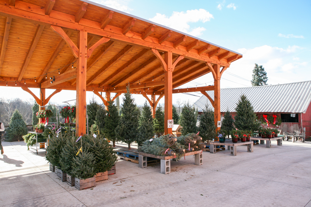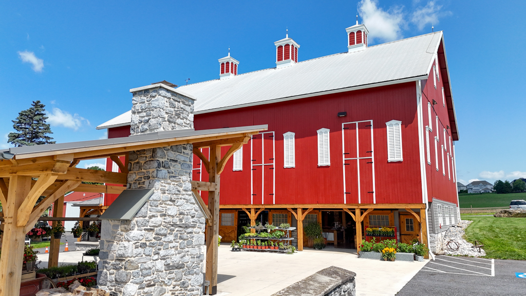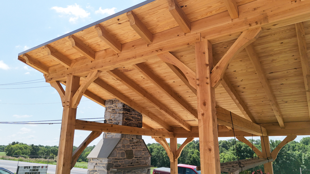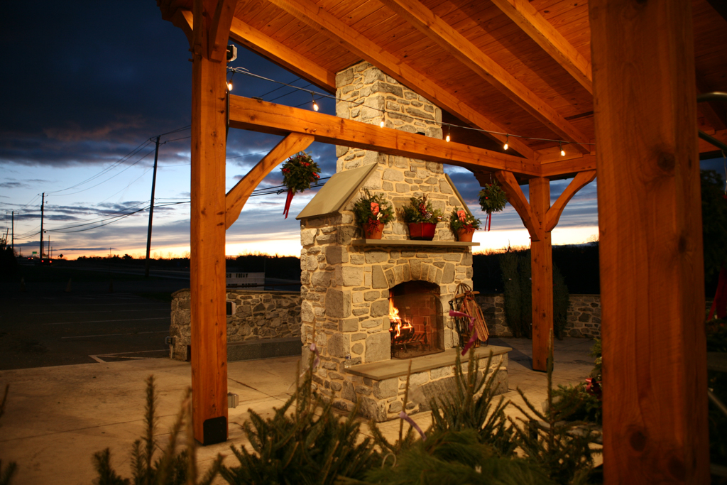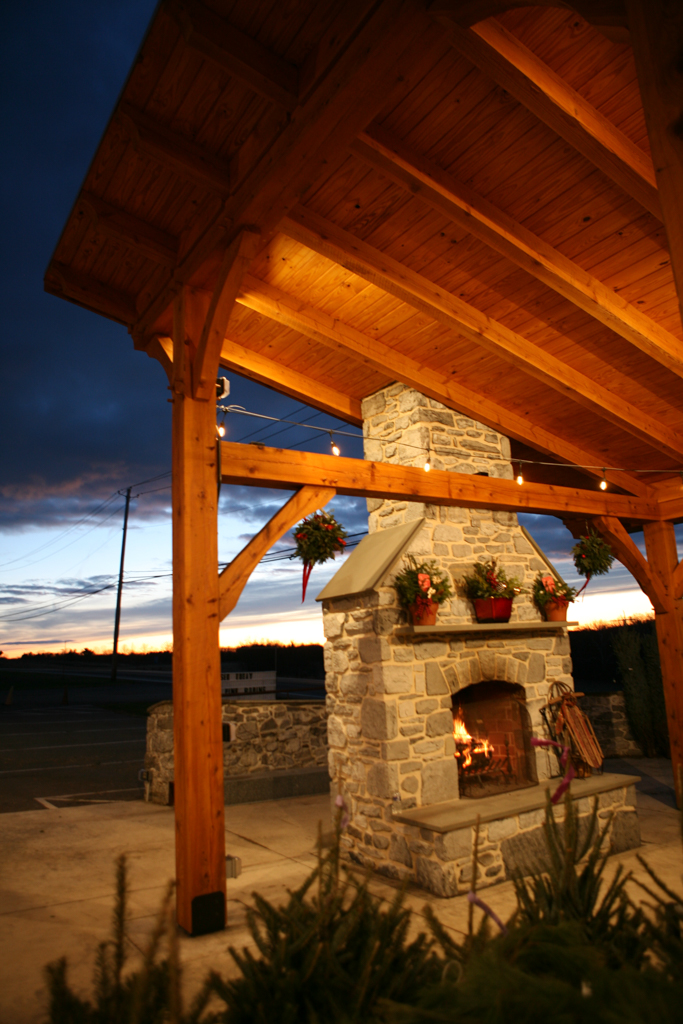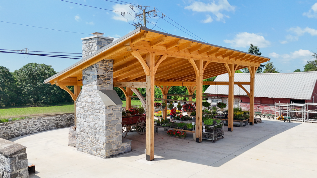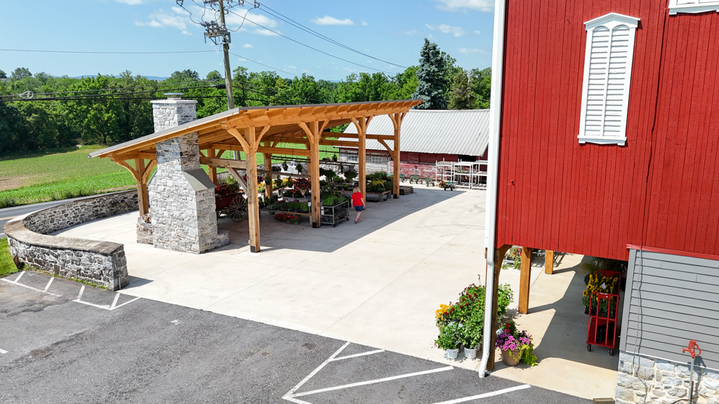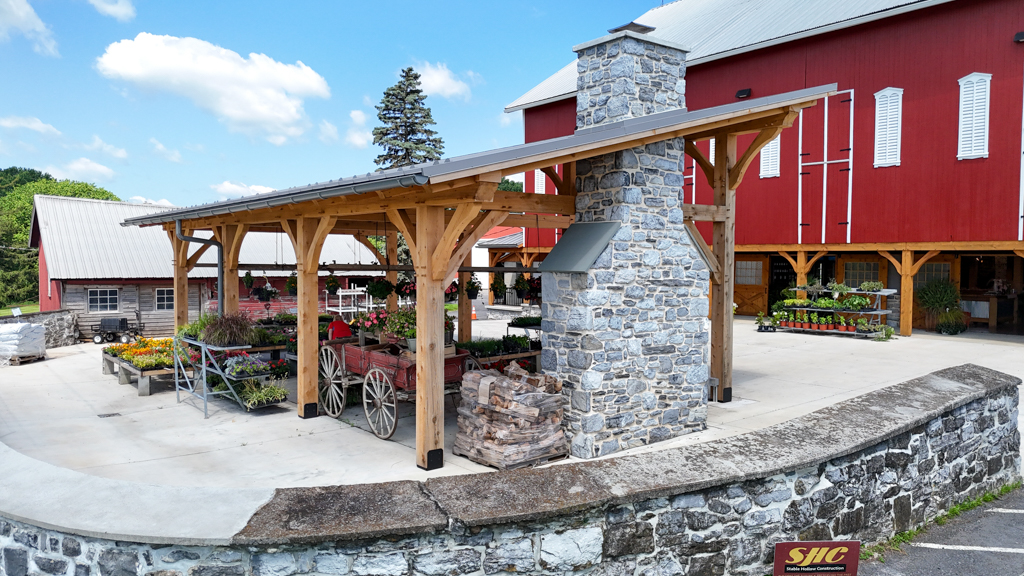 This timber-frame pavilion was the Phase 2 project for the Basehore Farm Market. After restoring the lower level of the barn, a large outdoor pavilion with a stone fireplace added shade and a place to gather.